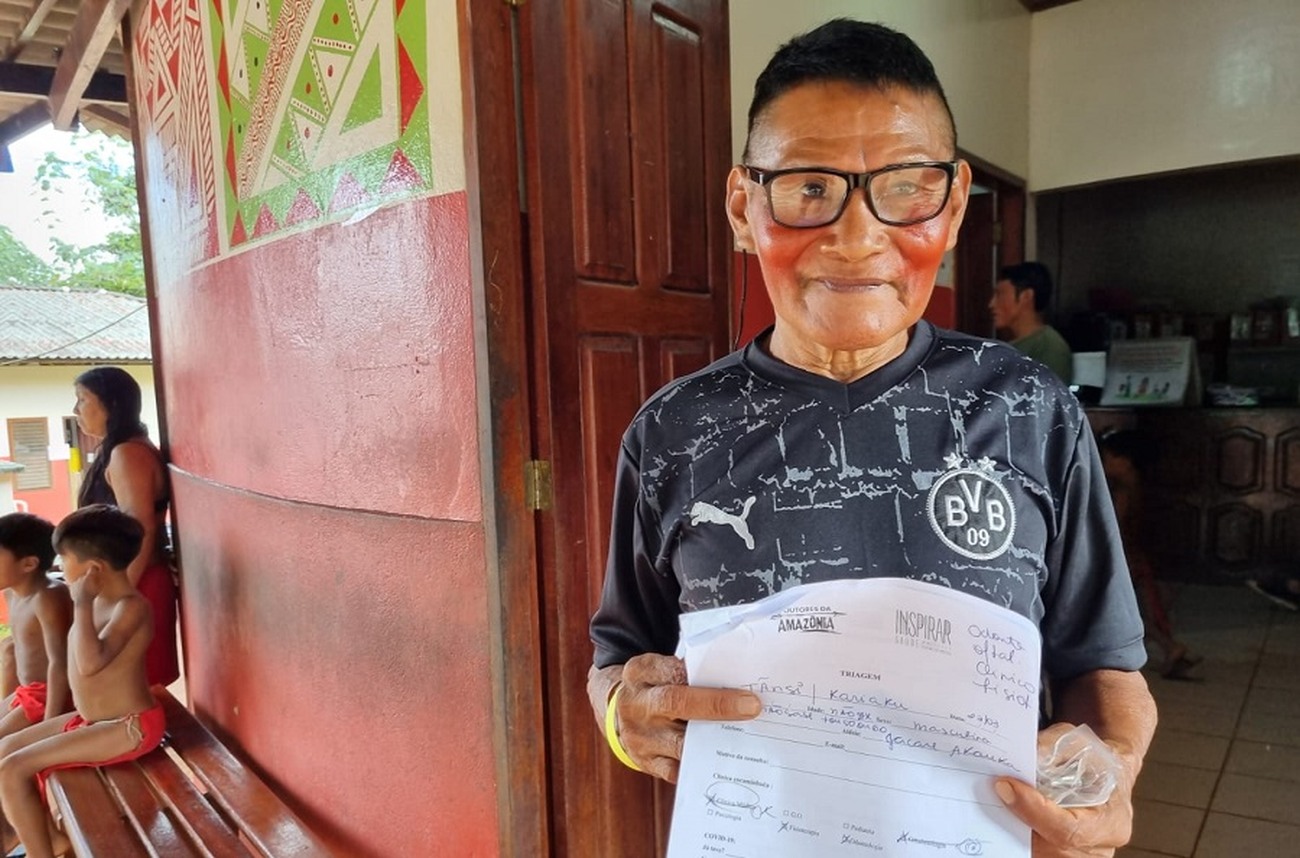 Com fortes dores na coluna, o indígena Tãsi Waiãpi, de 60 anos, estava enfrentando muitas dificuldades para realizar tarefas simples, como se locomover, sentar e até mesmo deitar para dormir. Na ação Mais Sorrisos, uma parceria entre o Governo do Amapá e a Organização Não Governamental (ONG) Doutores da Amazônia, ele teve atendimento médico e, após a consulta, recebeu todos os remédios receitados para tratar o desconforto.