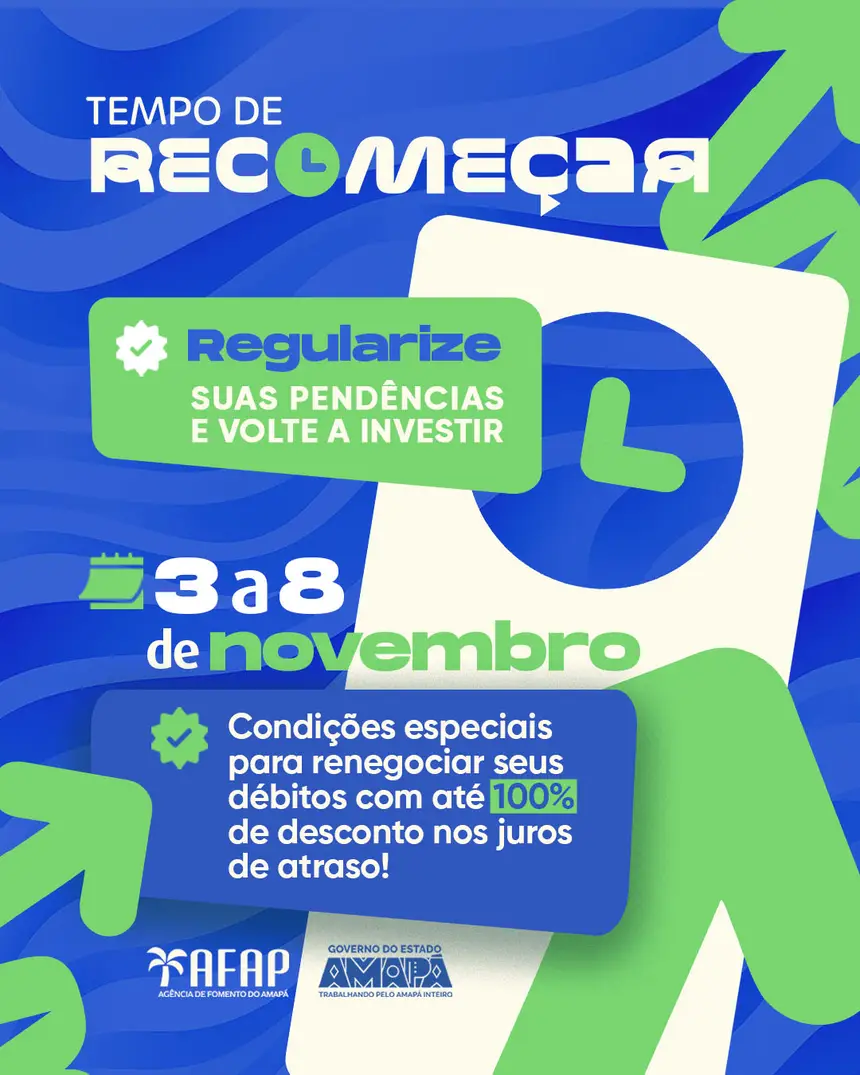 A Agência de Fomento do Amapá (Afap) realiza, no período de 3 a 8 de novembro, a campanha Tempo de Recomeçar, voltada a clientes que possuem parcelas em atraso em seus financiamentos. A iniciativa oferece condições especiais de renegociação, com até 100% de desconto nos juros de mora, aqueles cobrados em razão do atraso no pagamento das parcelas, e atendimento individualizado durante toda a semana.