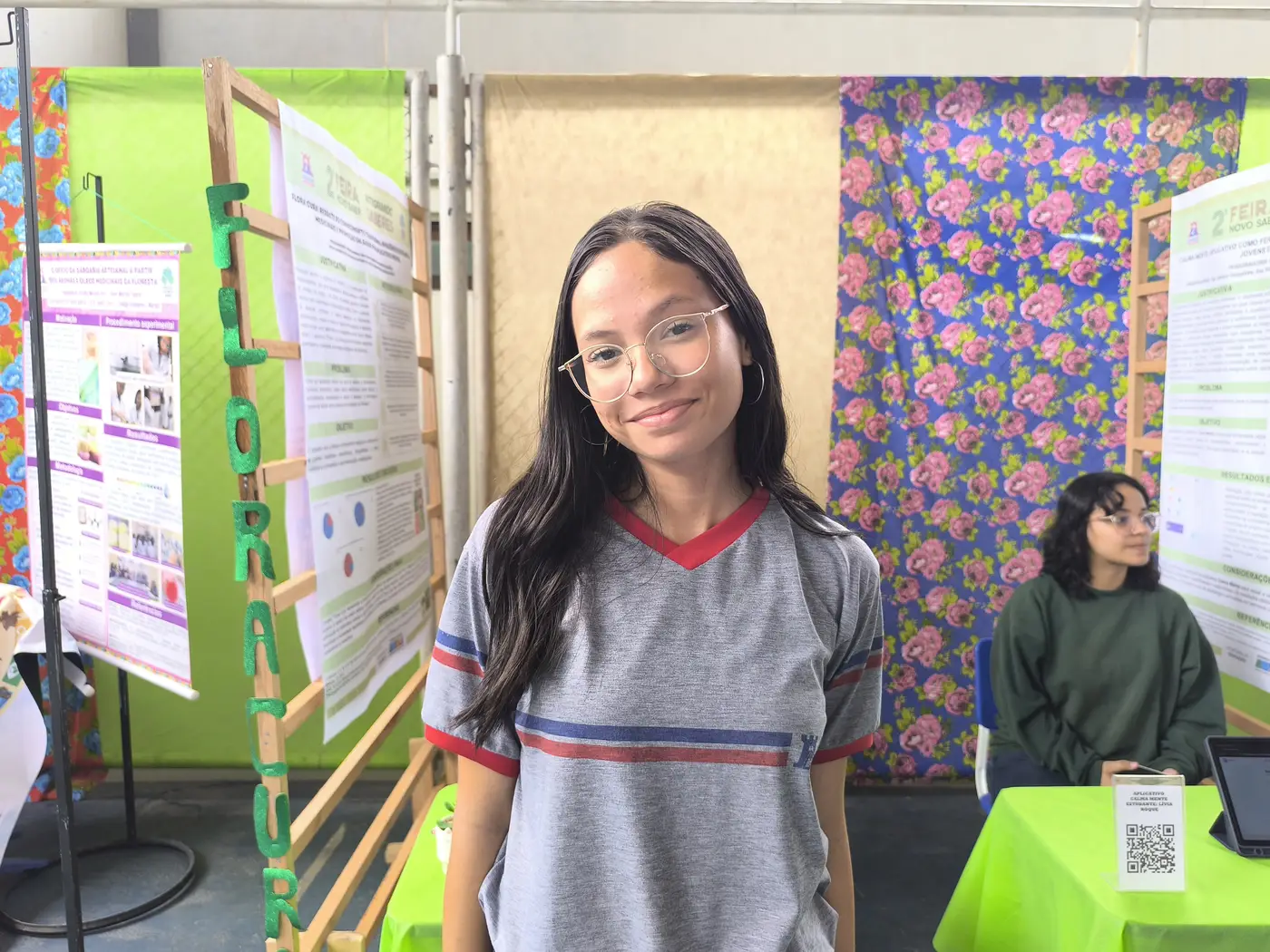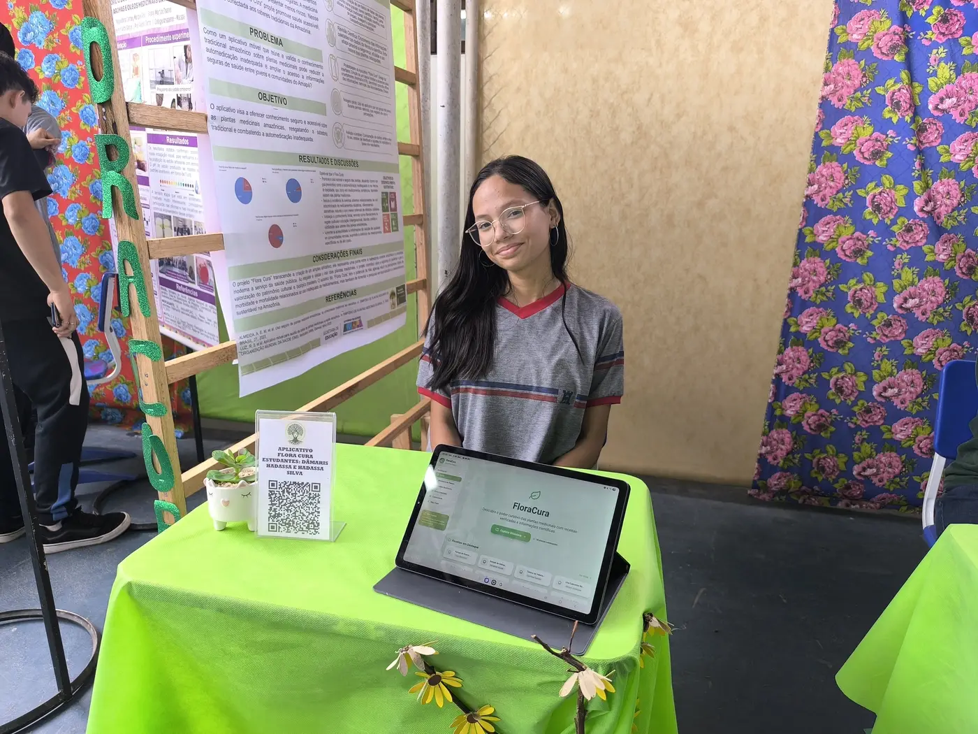 Um dos projetos expostos é o da Hadassa dos Santos, de 15 anos. Junto a colegas, ela desenvolveu um aplicativo para acesso a conhecimento seguro sobre plantas medicinais amazônicas, visando resgatar a sabedoria tradicional e, ao mesmo tempo, combater a automedicação inadequada.