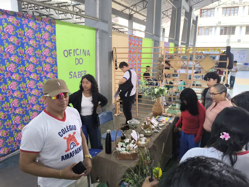 O professor de química do colégio, André Santos, fala do orgulho que sente em ver produtos pensados e feitos pelos estudantes. Alguns dos projetos da escola foram apresentados no stand do Governo do Amapá na COP30, em Belém, a pessoas de diversas nacionalidades.