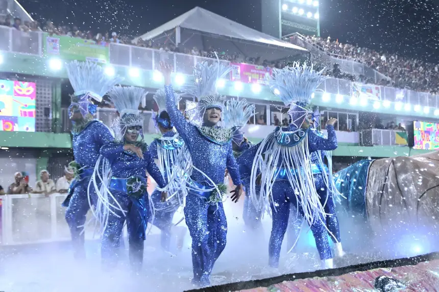 O grande destaque da noite foi a comissão de frente, que surpreendeu o público com um cenário impactante: uma piscina com cerca de 1.000 litros de água, utilizada como elemento central da coreografia. A água foi lançada na avenida e também interagiu com os foliões, criando um efeito visual e sensorial que arrancou aplausos das arquibancadas.
