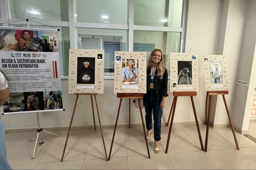As telas expostas trazem criações lúdicas inspiradas em monumentos turísticos do Amapá, no cotidiano dos ribeirinhos e na fauna local, com silhuetas de araras, tucanos e bem-te-vis em composições coloridas.