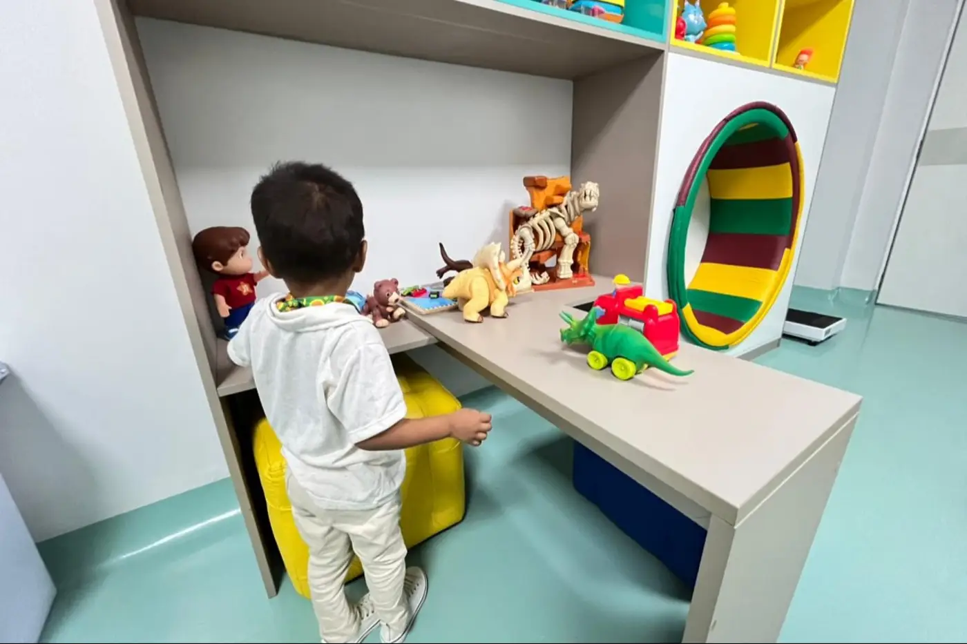 O tratamento do pequeno Juliano ocorre no ambulatório de neuropediatria do novo HCA, estruturado para o público infantil. O ambiente lúdico, com ilustrações nas paredes, espaço para brincar e consultórios temáticos contribuem para tornar a consulta mais tranquila, favorecendo tanto o paciente e família, como para o profissional de saúde.