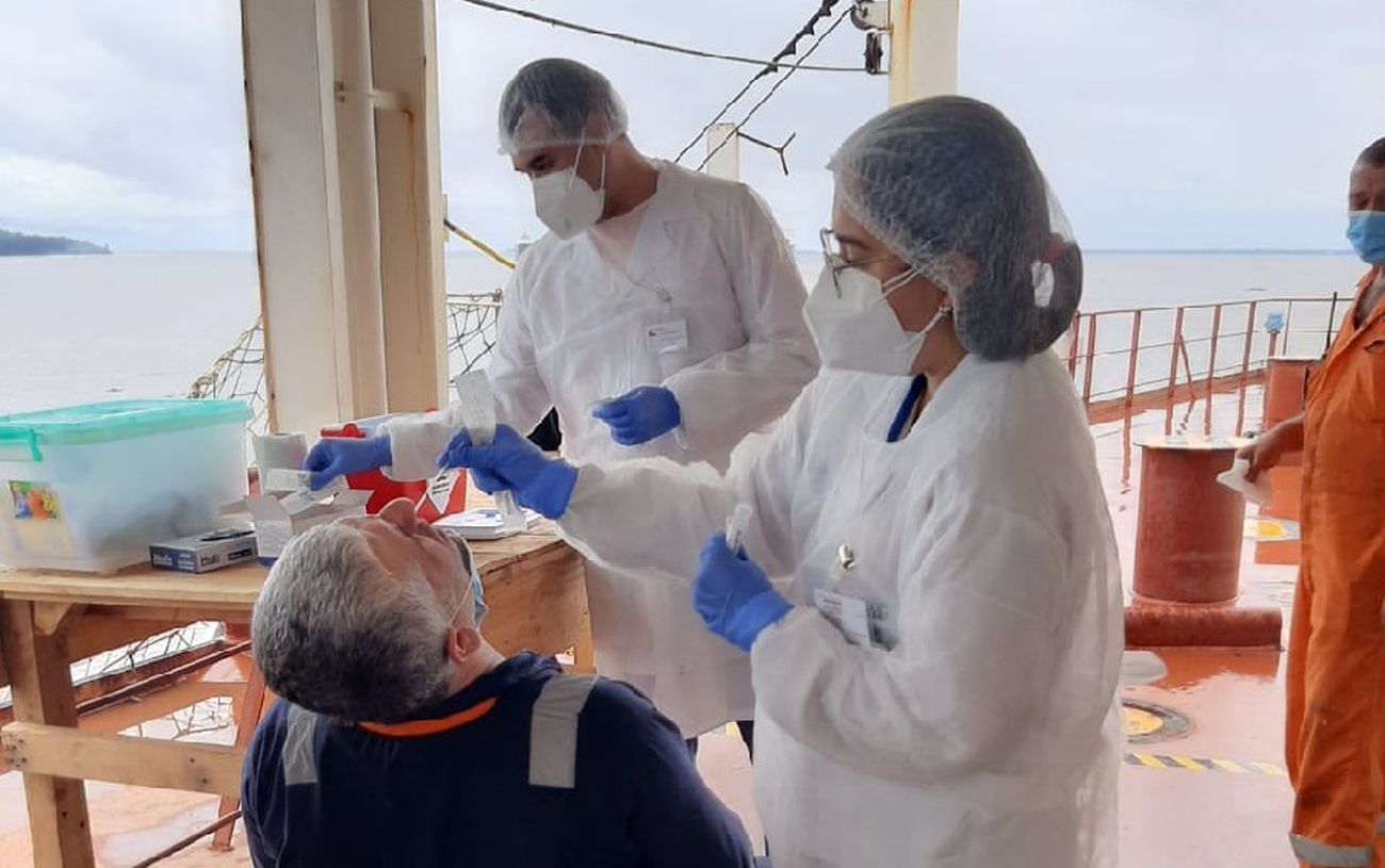 A Superintendência de Vigilância em Saúde do Amapá (SVS) testou, nesta quarta-feira, 29, 16 tripulantes de um navio com bandeira das Ilhas Marshall, país da Oceania, que está fundeado no Rio Amazonas, em frente à cidade de Macapá. Dos 16 tripulantes - com nacionalidades da Ucrânia, Geórgia e Síria - quatro testaram positivo, outro já havia sido confirmado com a doença, totalizando cinco pessoas com o novo coronavírus.