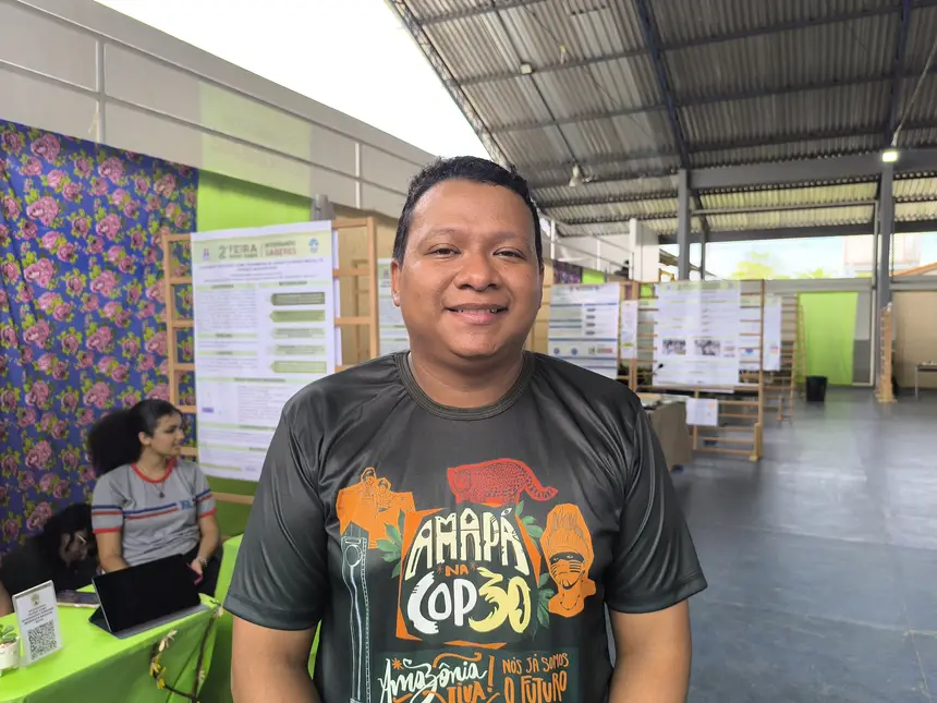 O professor de química do colégio, André Santos, fala do orgulho que sente em ver produtos pensados e feitos pelos estudantes. Alguns dos projetos da escola foram apresentados no stand do Governo do Amapá na COP30, em Belém, a pessoas de diversas nacionalidades.