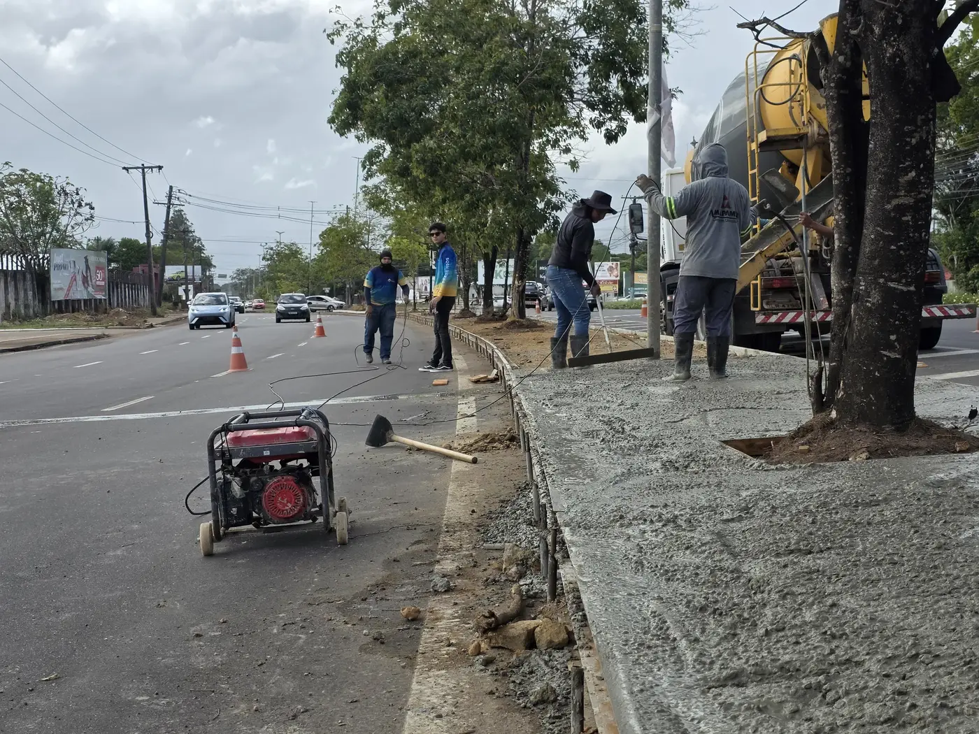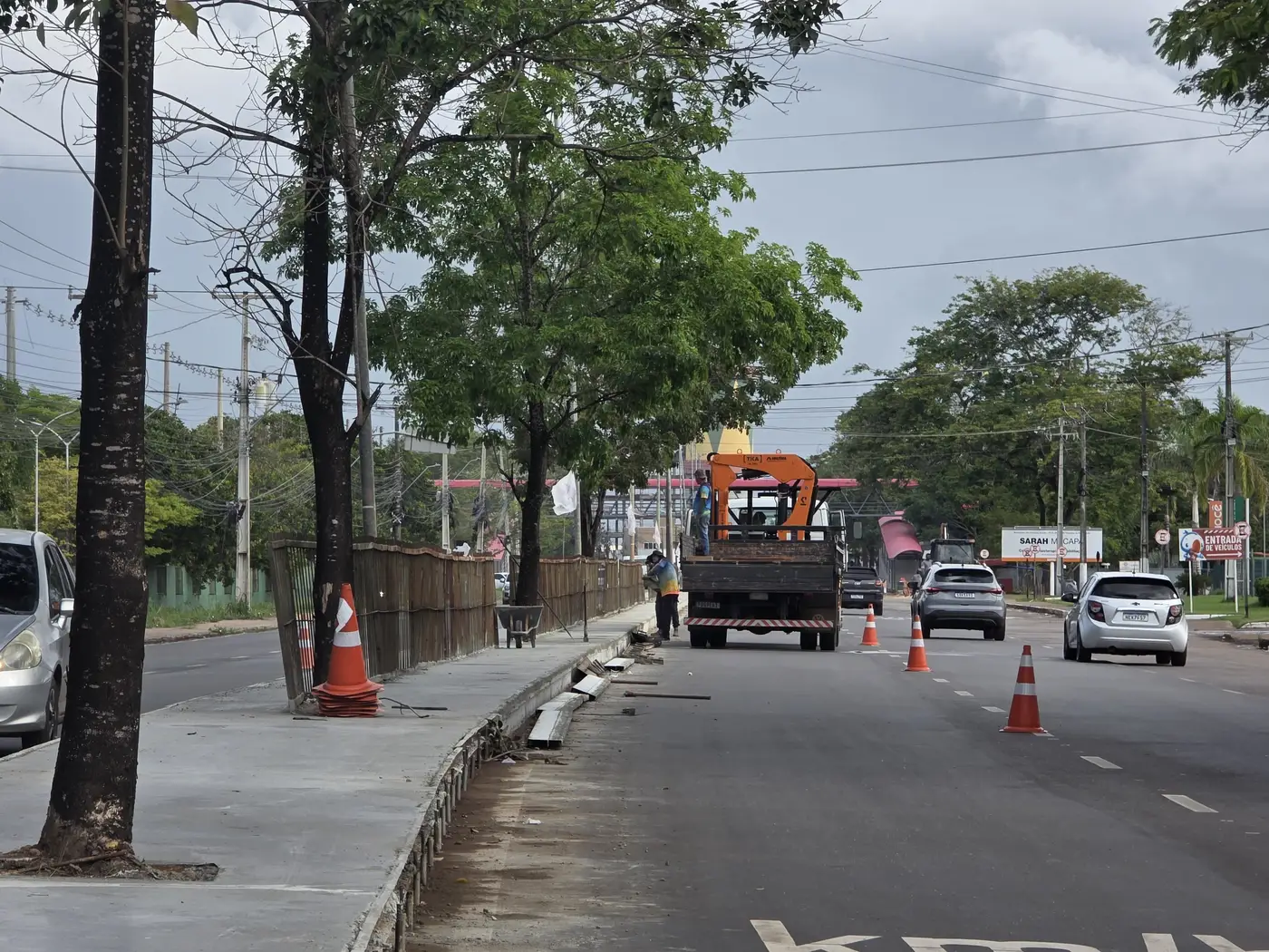 O canteiro central também está recebendo o mesmo serviço nos pontos em que há necessidade de drenagem, os demais permanecem com a arborização e iluminação central.