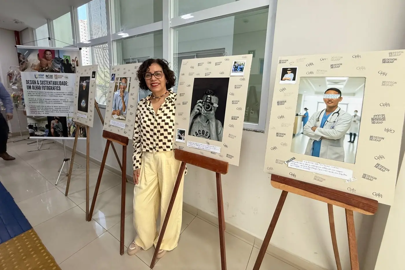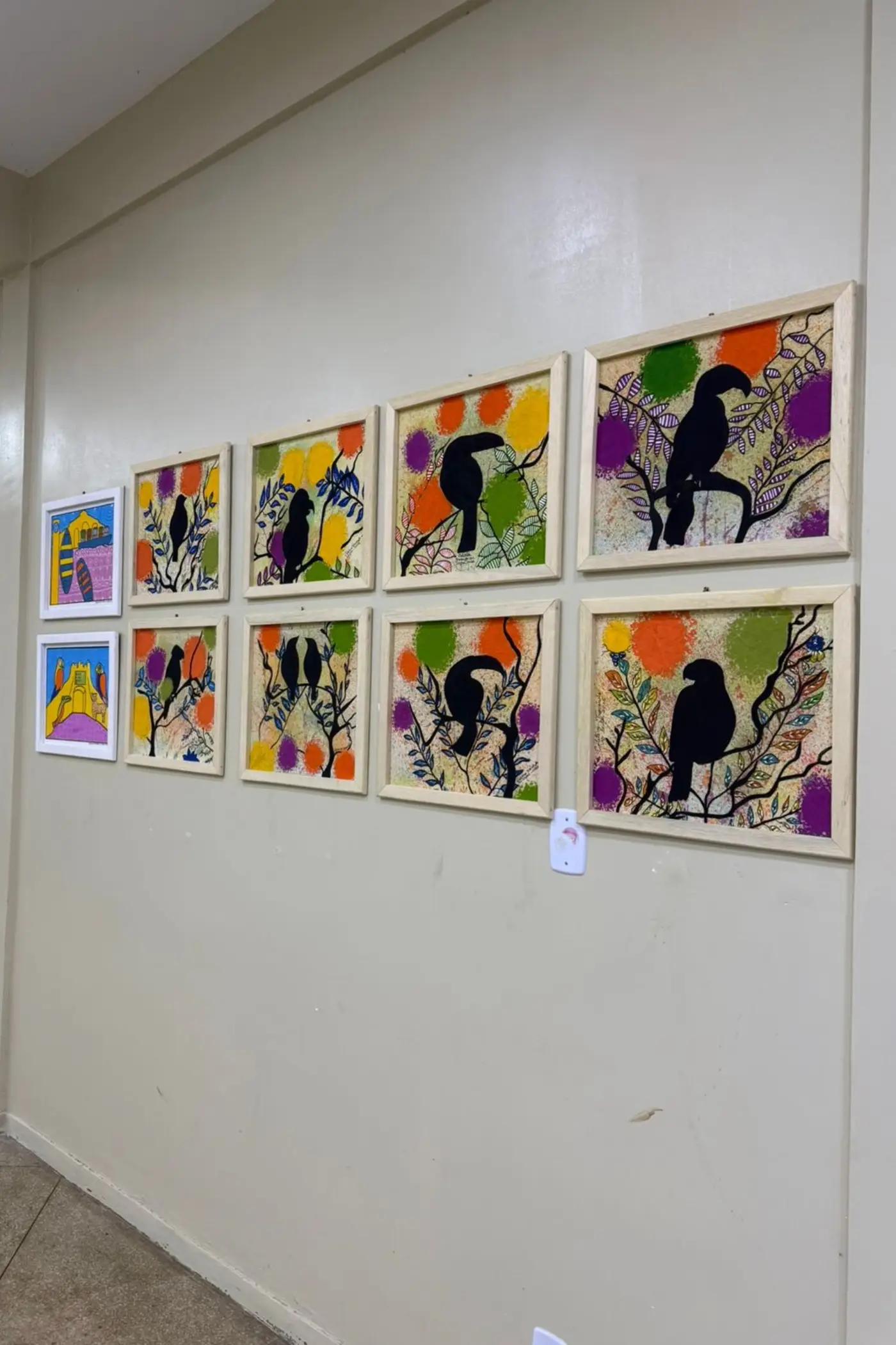 As telas expostas trazem criações lúdicas inspiradas em monumentos turísticos do Amapá, no cotidiano dos ribeirinhos e na fauna local, com silhuetas de araras, tucanos e bem-te-vis em composições coloridas.